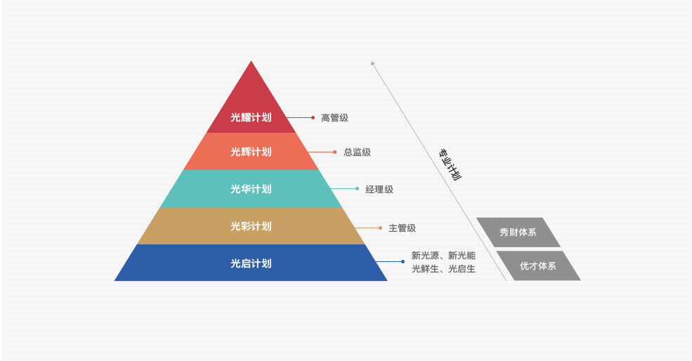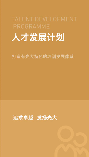 【光彩計劃】引導主管級員工慢慢從“管事”到“理人”的思維轉變,培養公司管理人才梯隊,同時強調貼近業務一線,達到懂業務,快執行,學管理的三體合一的復合標準。 -